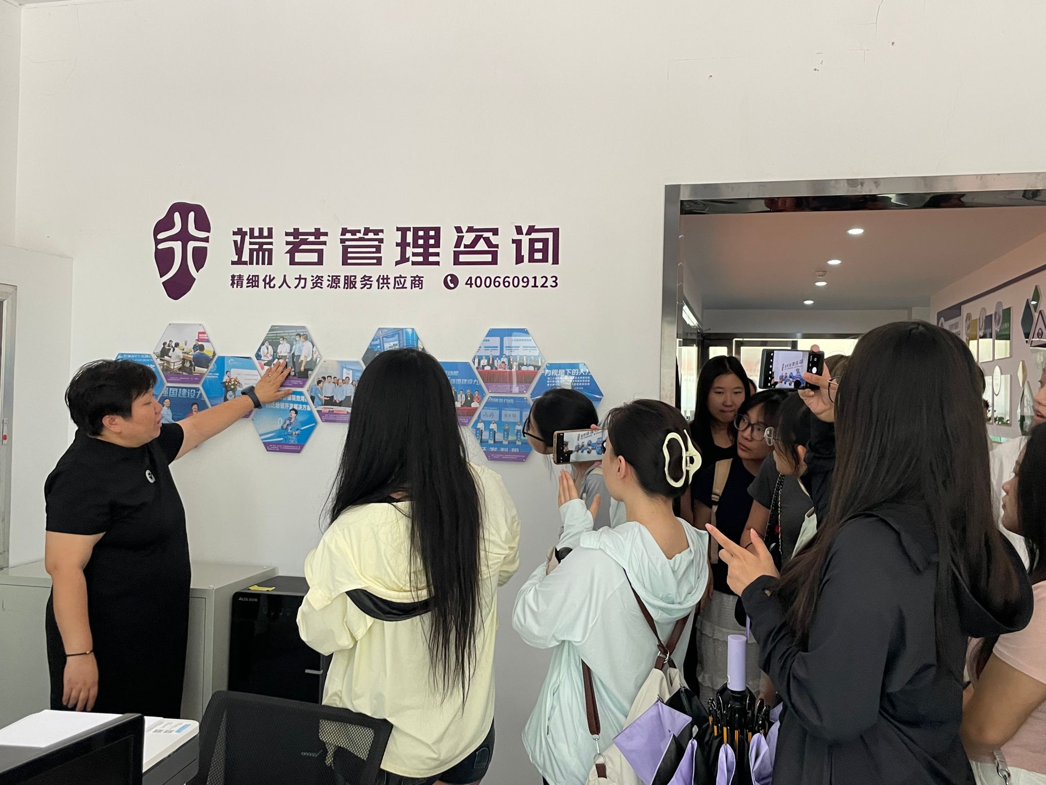 在高静的陪同下,师生们探访了充满人文关怀的员工功能区。悦茶乐园内员工创意手作工艺品引得同学们驻足品评,高标准配置的心理咨询室及其减压设施,直观展现了企业构筑“健康职场生态”的系统化解决方案。随后,高静又详细介绍了端若在人才服务、培训发展、市场调研等六大核心业务板块的运作模式,并进一步强调端若的核心竞争力在于“技术驱动服务升级”,持续引领行业数字化工具应用与解决方案创新。