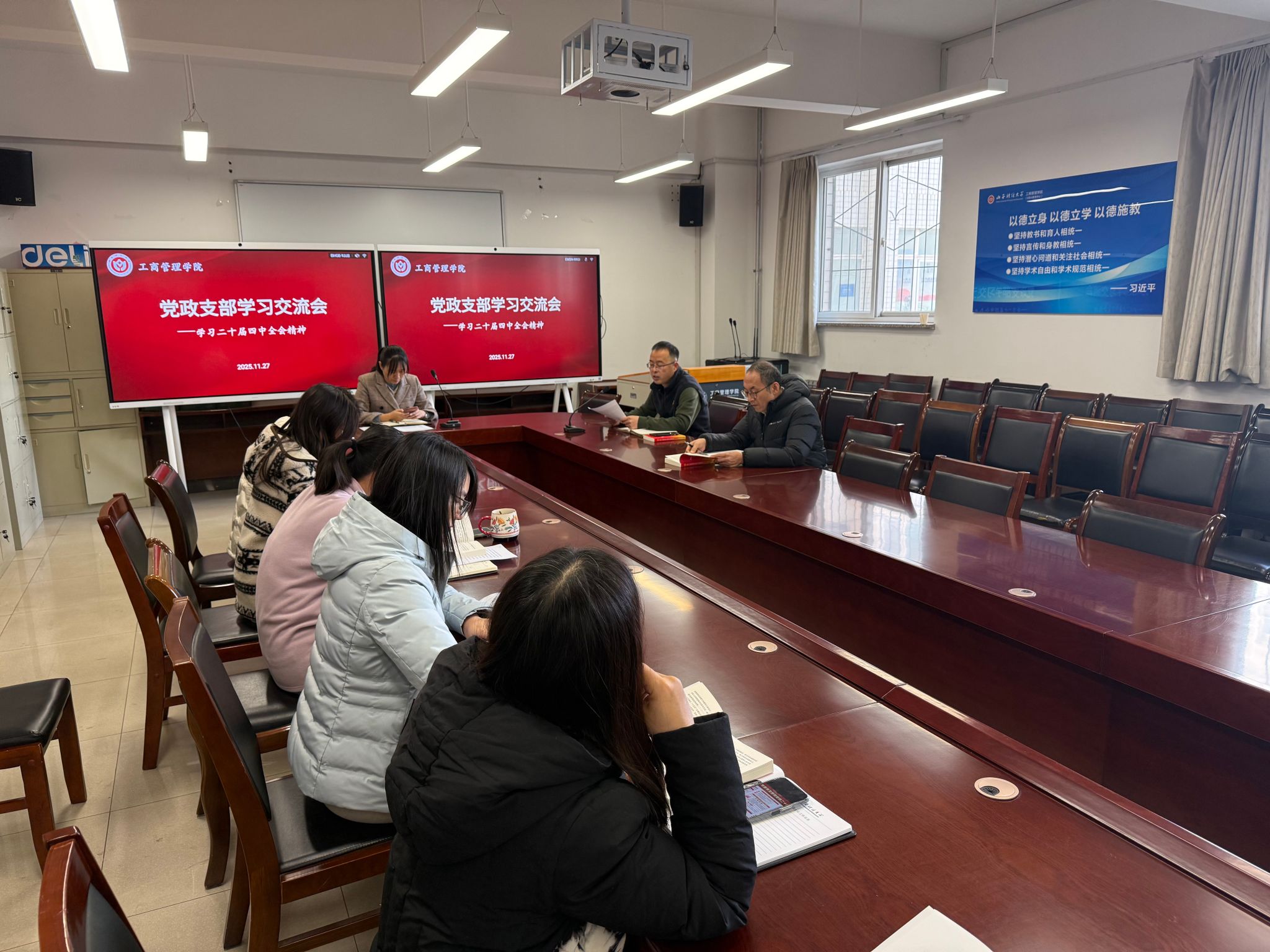 学习结束后,党员们结合自身工作实际交流学习心得。大家纷纷表示,通过此次学习,对全会精神有了更深刻的理解和把握。有的党员谈到,从街头小商贩规范经营到高校人才引育政策优化,真切感受到国家“稳就业、稳市场”的民生温度;有的党员结合辅导员工作,提出要针对07后学生的个性特点创新工作方法,加强思想引导;有的党员从教学管理、科研服务等角度出发,建议进一步优化工作流程,提升服务师生的效率和质量。大家一致认为,要将全会精神转化为推动工作的实际行动,立足岗位、担当作为,为学院高质量发展贡献力量。