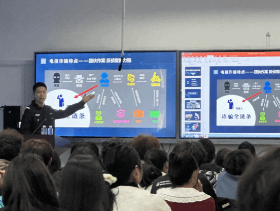 紧接着冯警官指出诈骗手段层出不穷会结合时事不断更新,普遍由团伙作案反侦察能力强。两位警官通过身边的案例纠正了同学们“自己不会遇到诈骗”的心理误区。最后,面对刷单、注销校园贷、虚假投资理财、冒充公检法、杀猪盘诈骗、冒充网络游戏客服等不同类型的诈骗,冯警官提醒我们要辨别不明软件,不随意相信陌生人,增强安全防范意识,要树立正确的价值观和金钱观,抵制不劳而获的观念。