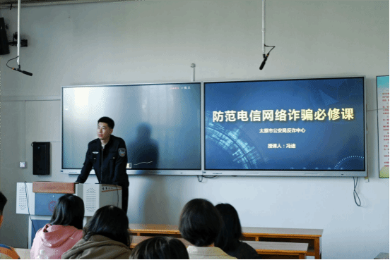 讲座伊始,太原市公安局小店分局北营派出所冯迪警官用简单而严厉的话语警示同学们:每个人都有可能被骗,现在没被骗不是你不会被骗,而是你还没有被骗!太原市反诈讲师李秉林警官通过电信诈骗公式让同学们认识到诈骗是由一环扣一环的流程组成的。