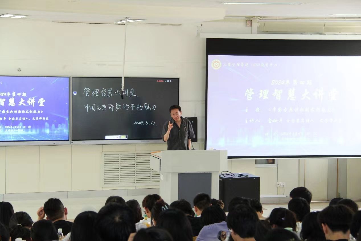 在立信楼304阶梯教室举办2024年第四期“管理智慧大讲堂”。本次活动特邀全国著名诗人、文学批评家金汝平先生作了题为“中国古典诗歌的不朽魅力”的专题讲座。学院2022级全体本科生及辅导员参加。学院党委副书记周志刚主持。