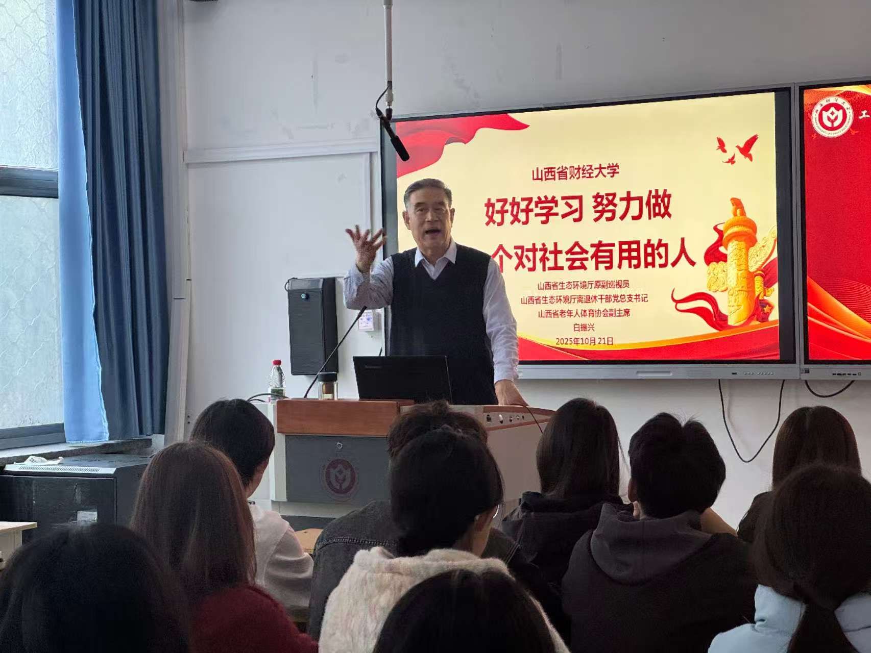 在迎泽校区北图202教室为2025级本科新生举办入学励志专题讲座。山西省生态环境厅离退休干部党总支书记、山西省老年人体育协会副主席、山西省生态环境厅原副巡视员白振兴,应邀为同学们作了《好好学习,努力做一个对社会有用的人》专题讲座。