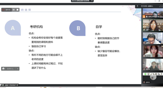 为帮助同学们进行考研规划与安排,11月9日晚上,市场营销专业通过腾讯会议举办了线上考研经验分享会,邀请了近两年考取了硕士研究生的赵颖卉、李歆迪、郭彦麟和梁琪蕊四位同学分享了考研过程中的经验和教训,并给出一些建议,20级和21级市场营销专业的100多位同学参加了分享会,分享会由营销管理教研室主任周晔老师主持。