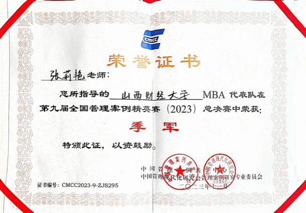 指导老师:张莉艳副教授。在本次全国管理案例精英赛全国赛中,我们又经历了一次大赛的考验,重组团队、赛前集训、赛中争分夺秒备赛、比赛现场惊心动魄观战。回想这一路走来,有手足无措的至暗时刻,面对难题充满慌张和沮丧。有观点不同导致的激烈争论,最终大家能互相妥协、集思广益。也有通力合作化解难题的欢呼雀跃,团队中总有高人,关键时刻能贡献智慧。这一路跌宕起伏,有惊无险,我作为指导老师也经历了一次成长和蜕变。管理案例精英赛是一次高强度商战模拟演习,比赛中和各大院校队伍同台竞技、历练技能、展示风采,这是一次难得的锻炼机会,能发现我们的优势和不足。在第一次参赛的情况下,能取得区域赛冠军和全国赛季军的成绩,实属不易,证明了我们的实力。在经历了区域赛后,二年级的老队员们进步飞快,不仅能继续保持热情,还能挑起大梁。新加入的一年级新队员们,充满活力,有很强的求知欲,潜力无限。总之,我们的团队充满智慧和能量,大家相互信任、通力配合,关键时刻能勇挑重担、敢于决策,虽然每天睡眠严重不足,但每个人都热情饱满,干劲十足。感谢和我一起并肩作战的同事和同学们,这是一次特殊的人生体验,我们圆满完成任务,为自己点赞!