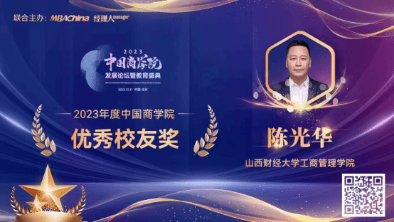 荣获“2023年度中国商学院MBA项目TOP100”第55名;学院院长卫虎林教授荣获“2023年度中国商学院杰出院长奖”;2012届EMBA校友、长城电气股份有限公司董事长陈光华荣获“2023年度中国商学院MBA项目优秀校友奖”。