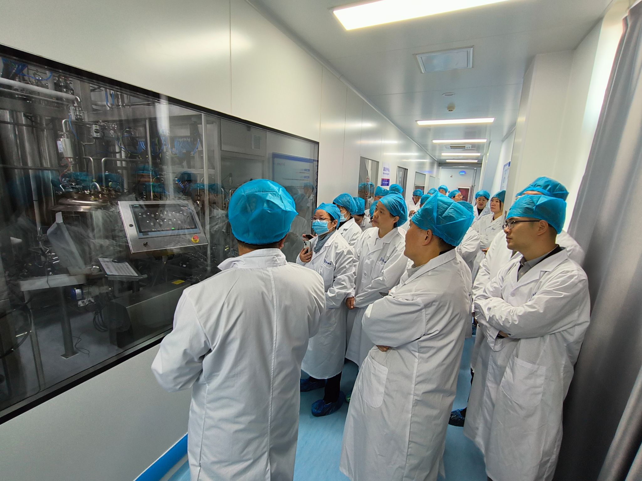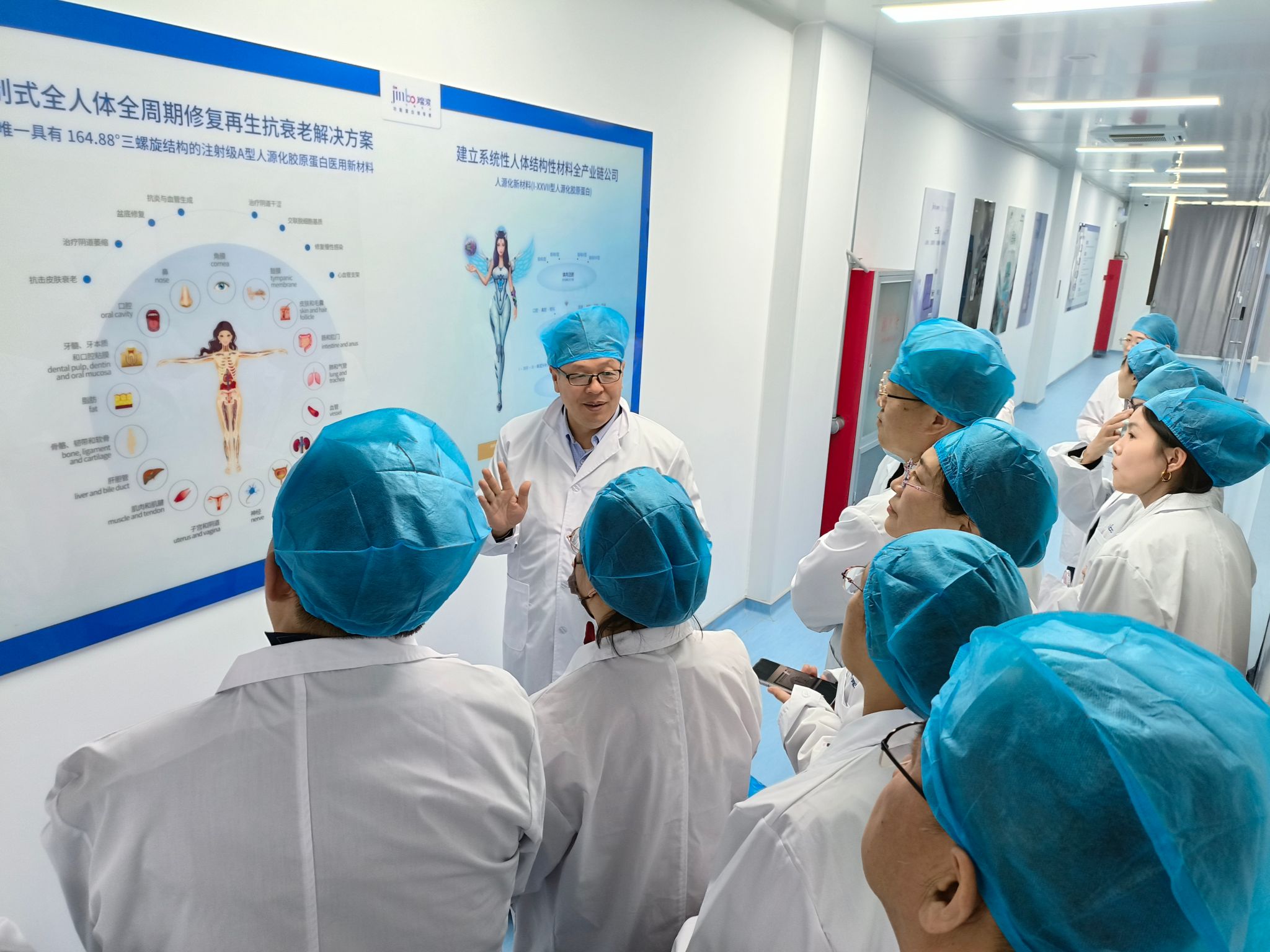参访团队首先来到了锦波生物合成产业园,参观了人体生物材料工业化研发车间和冻干纤维车间,详细了解公司的核心产品以及主要功能。在参观过程中,陆晨阳副总经理向大家仔细讲解了人源化胶原蛋白生物发酵工艺的主要流程,包括酵母/细菌培养、种子培养、10T 级大规模发酵、碟离收取上清、中空澄清洗滤、超滤浓缩换液、以及冻干等。同时,陆晨阳副总经理还就锦波生物公司的创办背景、发展历程、未来方向进行了详细介绍。