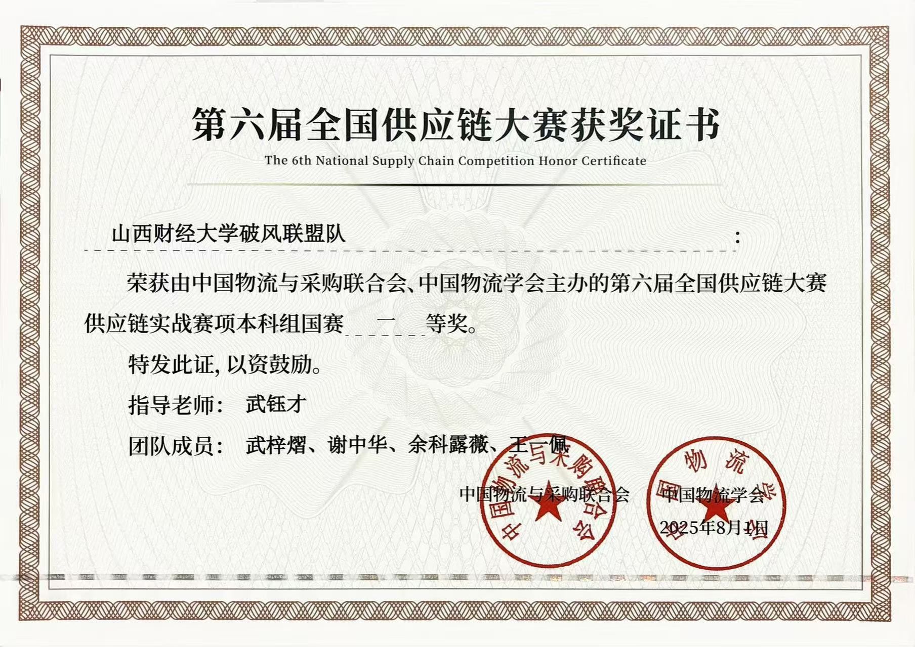 物流管理教研室武钰才老师指导的参赛队荣获全国一等奖。
