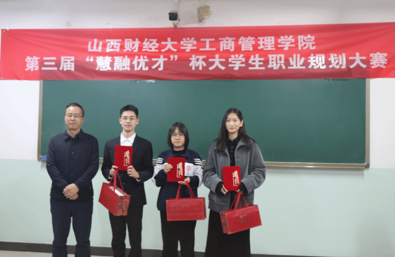 颁奖典礼在热烈的气氛中举行。人力资源教研室主任张征教授揭晓获奖名单后,隆重的颁奖仪式随即开始。中科远航建设有限公司总经理徐强、山西智胜传媒科技股份有限公司副总经理许初裕,学院党委副书记周志刚、学院党委书记李群生依次为三等奖、二等奖、一等奖获得者颁授了荣誉证书与奖品,并与学子们共同分享了这份成功的喜悦与荣耀。