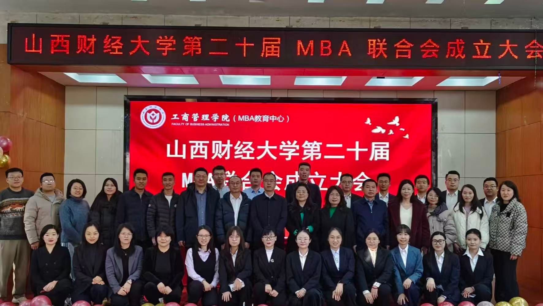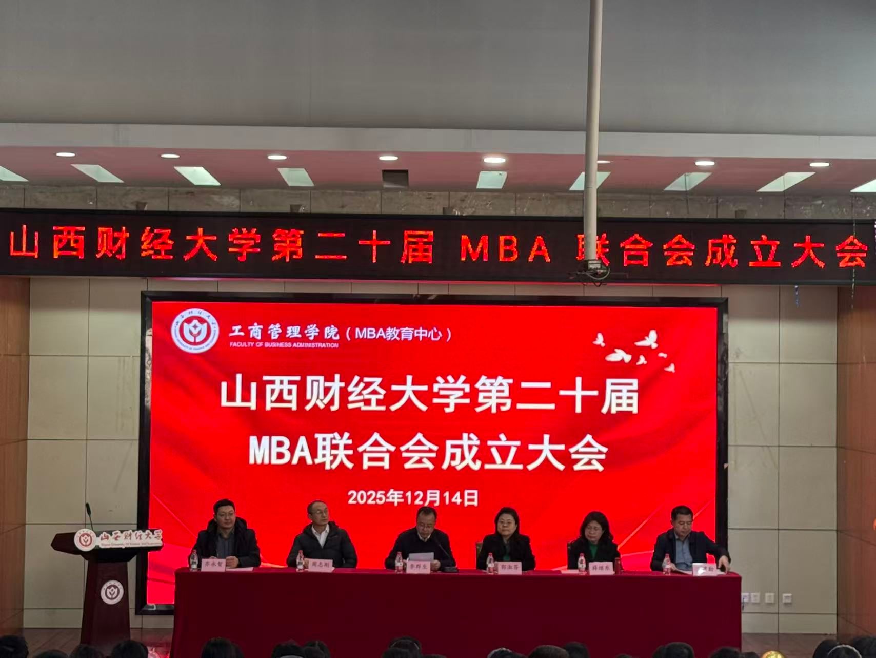 第二十届MBA联合会成立大会在坞城校区敏行楼301学术报告厅隆重举行。学院领导班子全体成员、MBA教育中心全体工作人员、2025级班主任、MBA校友会会长、第十九届联合会代表、本科生及研究生学生会代表、2025级MBA全体学生等200余人参会,大会由学院党委书记李群生主持。
