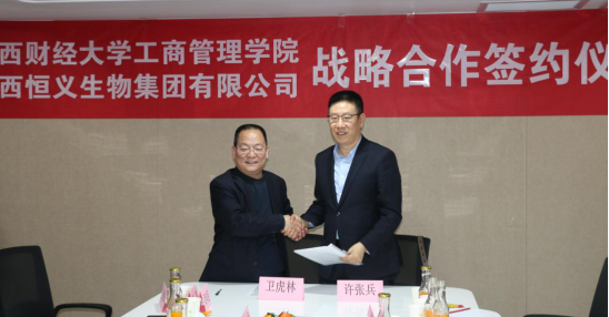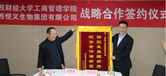 随后,卫虎林院长与许张兵董事长代表双方单位签署了战略合作协议。同时,为了表达恒义生物集团对学院在MBA20周年庆典活动的支持,卫虎林院长代表学院向恒义生物集团赠送“转型发展蹚新路,院企合作谱新篇”荣誉锦旗。