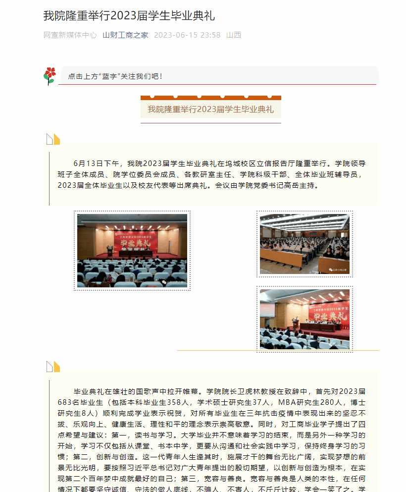 校友会会长、山西毅圣数智消防股份有限公司董事长陈仲毅从战略高度、创新思维、整合能力三个方面为毕业生们指点迷津;教师代表、院学位委员会成员、管理原理教研室主任张莉艳老师用晋商精神“重信义、 除虚伪 、敦品行、 贵忠诚 、鄙利己、 奉博爱”十八字箴言鼓励同学们以诚信作为立业之本勇往直前。