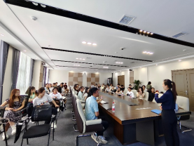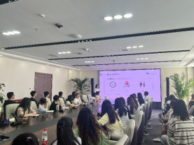 随后,同学们移步至智慧港9层的多功能会议室,由开发部侯倩进行主要产品的详细介绍。侯倩首先讲解了灵活用工行业的发展现状,并结合行业趋势探讨了未来的发展方向,解释了公司为何选择灵活就业人员作为服务对象的创业初心和战略构想。接着,她选取了企业服务的六个真实案例场景,详细介绍了水木年华数智零工市场平台、水木年华灵活用工saas系统和“男哥找活”产品。企业研发的这些基于高科技信息技术的人力资源服务系统体现了企业对灵活用工市场的深刻洞察,通过高效对接人力资源供给,减少了资源错配和闲置。同时,通过满足多样化的用工方式和新型工作模式的需求,为未来就业市场变革和劳动关系变革提供高质量的人力资源服务。业务内容的讲解引起了同学们的浓厚兴趣。