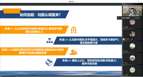 首先,贾老师根据自己的实践经验,指出应从企业和现实中提炼问题,做生活的有心人;应从文献中提炼问题,做文献的修行家;应从国际性前沿研究与中国现实的结合中提炼问题,做理论与实践对接的高手;应做学术的先锋,认准国际上公认、有挑战性的问题。随后,贾老师结合具体文献研究,提出找到有趣且重要的管理研究问题是存在所谓“套路”的,如在热点中找冰点、思考研究对象是否可改变、为老概念寻找新情境、根据研究结论推理问题、在现有文献中找缺口、关注学科交叉问题等等众多策略。接着,贾老师以自己朋友圈评论为例,揭示出应具备延伸思维(从近端影响走向远端影响)、反向思维、转换视角思维,以便探寻到有价值的研究问题时,能够生动地将其描述出来。