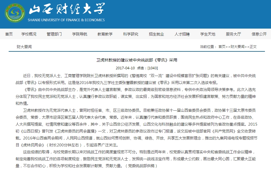 院长卫虎林教授所撰写的《警惕高校“双一流”建设中规模盲目扩张问题》的有关建议,被中共中央统战部《零讯》以专报形式采用。这是继2016年直播色情