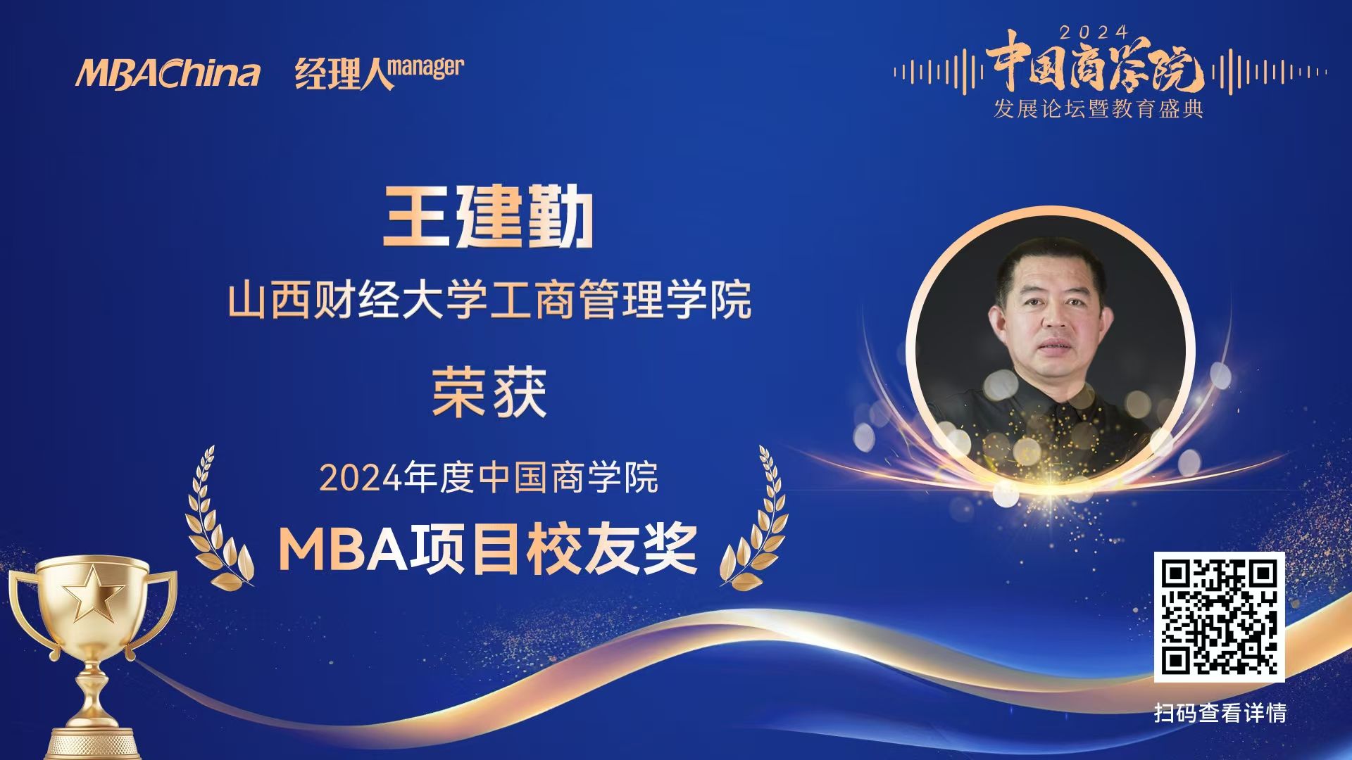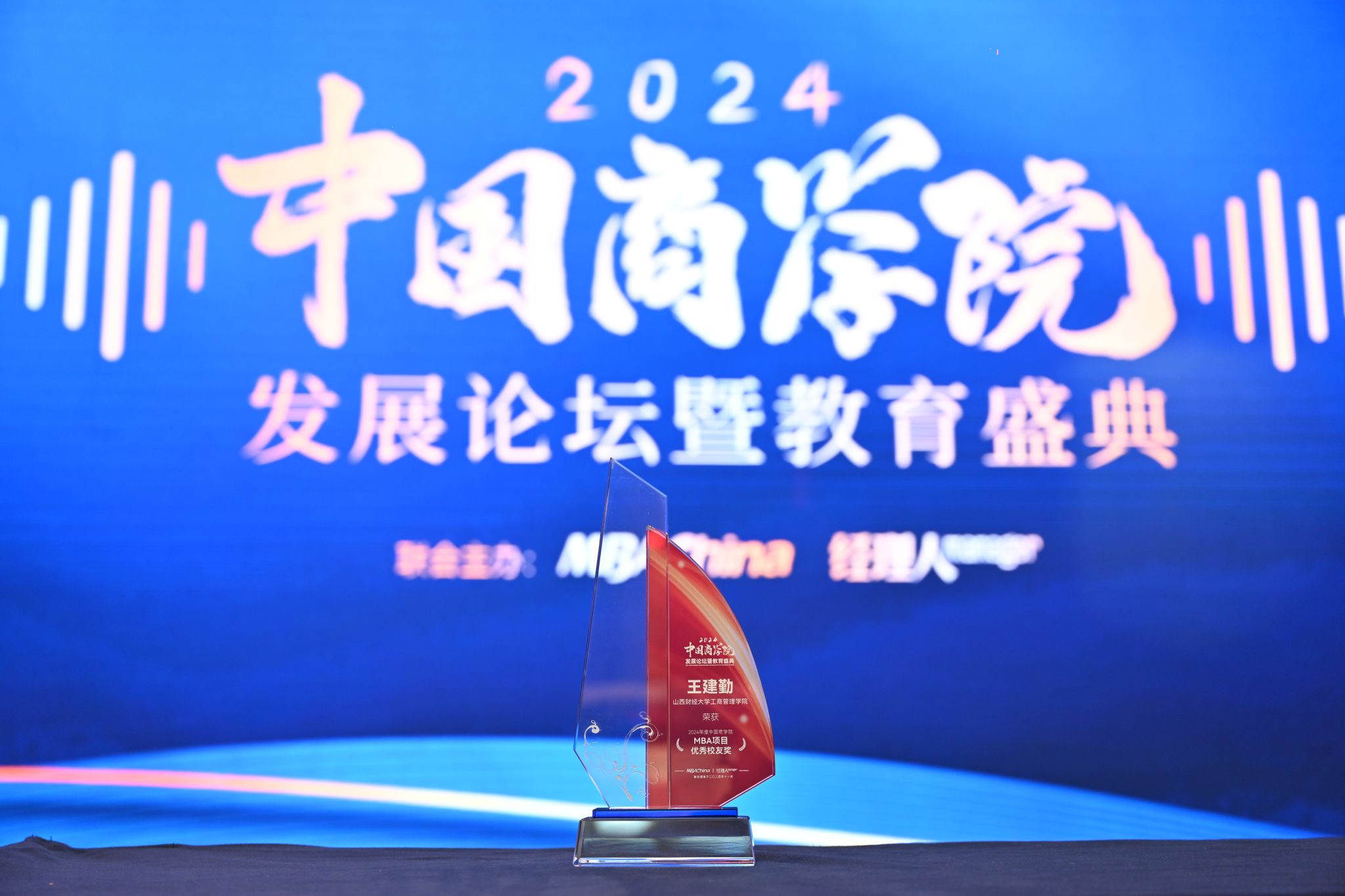 MBA校友会会长、山西北林建设工程有限公司王建勤,以其卓越的领导力、续的创新精神和对社会的杰出贡献,荣获“2024年度中国商学院MBA项目优秀校友奖”。