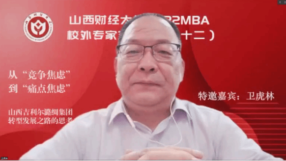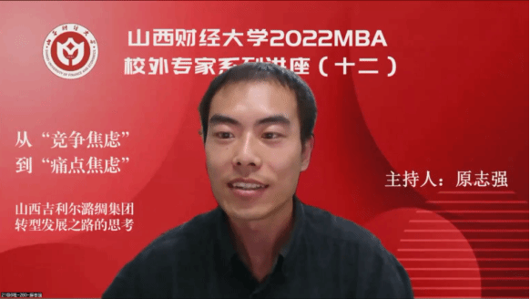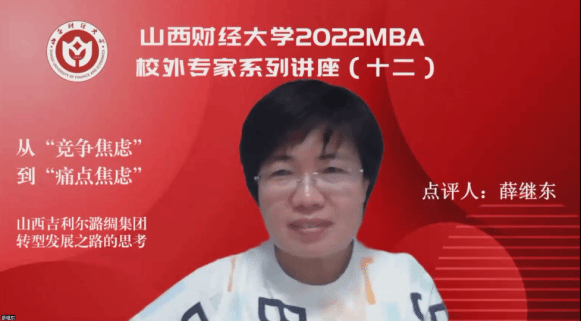 2022MBA校外专家系列讲座第十二期在“腾讯会议”平台圆满举办。山西吉利尔潞绸集团织造股份有限公司董事长王淑琴带来了题为《从“竞争焦虑”到“痛点焦虑”——山西吉利尔潞绸集团转型发展之路的思考》的专题讲座,2022级MBA学员、部分MBA教师、MBA校友等近300人参加,本期讲座还得到MBAChina网站的同步转播。