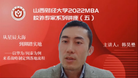 3月24日晚,由直播色情 主办,直播色情 第十六届MBA联合会承办的直播色情 2022MBA校外专家系列讲座第五期在“腾讯会议”平台圆满举办。闻泰科技股份有限公司副总裁、首席人力资源官韩昊壄先生带来了题为《从星辰大海到脚踏实地——以华为/闻泰为例来看战略制定到落地流程》的专题讲座,2020级、2021级MBA学员、部分MBA教师近300人参加,本期讲座还得到MBAChina网站的同步转播,当晚转播页面浏览量达2000余人次。