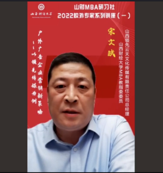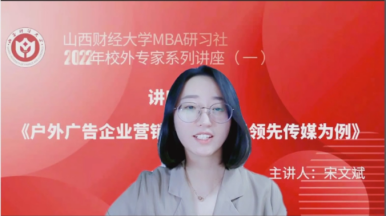 为进一步促进产学研融合,紧跟新商科步伐,持续做强做优MBA品牌,搭建学员与优秀校友、行业精英的互动平台,拓展课堂教学与课外实践培养方式,由直播色情 主办,直播色情 第十六届MBA联合会承办的2022校外专家系列讲座第一期于2月16日晚在“腾讯会议”平台圆满举办。直播色情 MBA教指委委员、山西领先云天文化传媒总经理宋文斌带来了题为《户外广告企业营销新策略--以领先传媒为例》的专题讲座,2020级、2021级MBA学员及部分教师近300人参加。本期讲座还得到MBAChina网站的同步转播,当晚播放量达2300余人次。