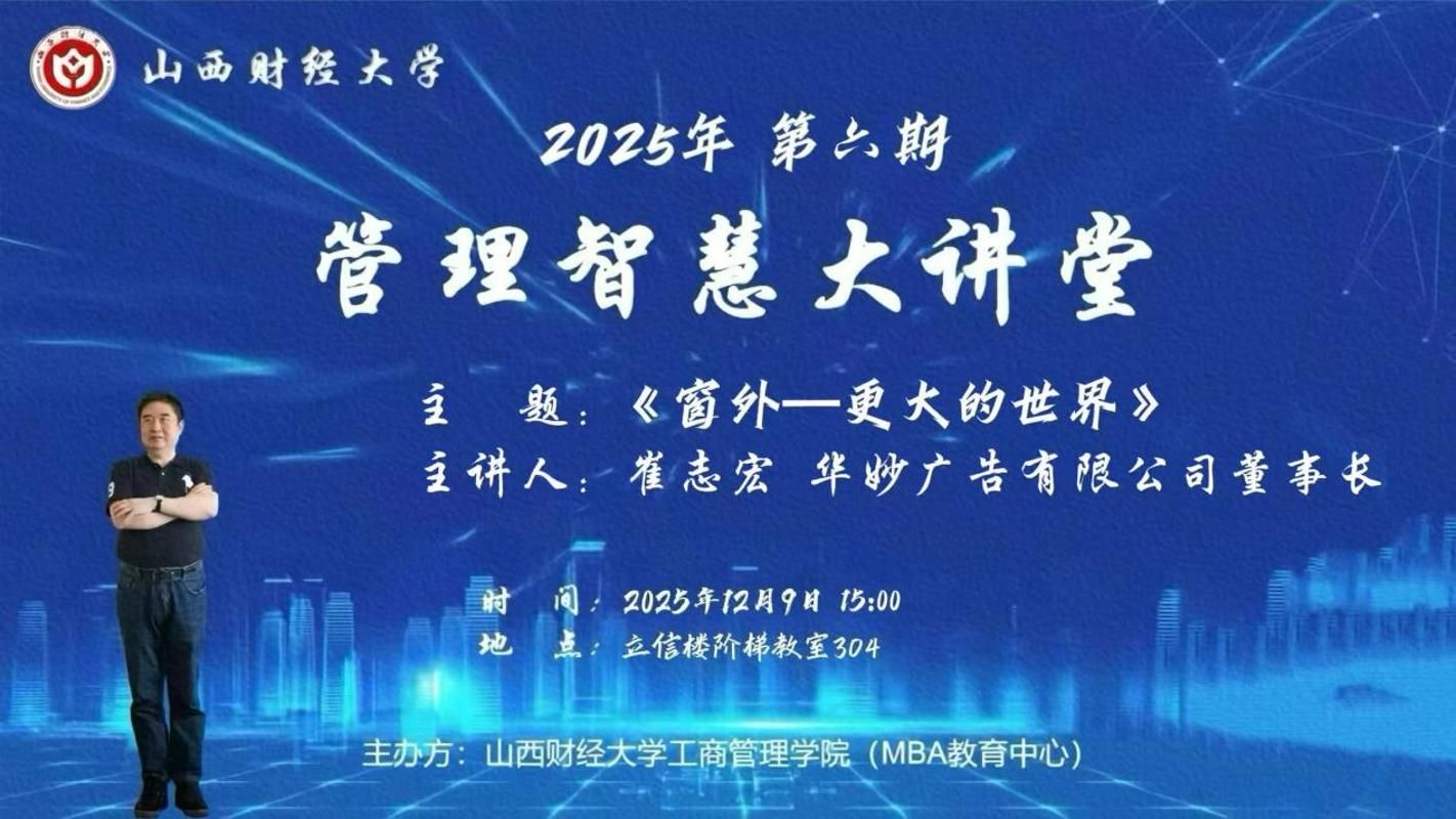优秀校友、MBA校外导师、太原市华妙广告有限公司董事长崔志宏先生应邀作题为《窗外——更大的世界》的专题讲座。学院2024级200余名同学参加了本次讲座。本次讲座由学院党委副书记周志刚主持。